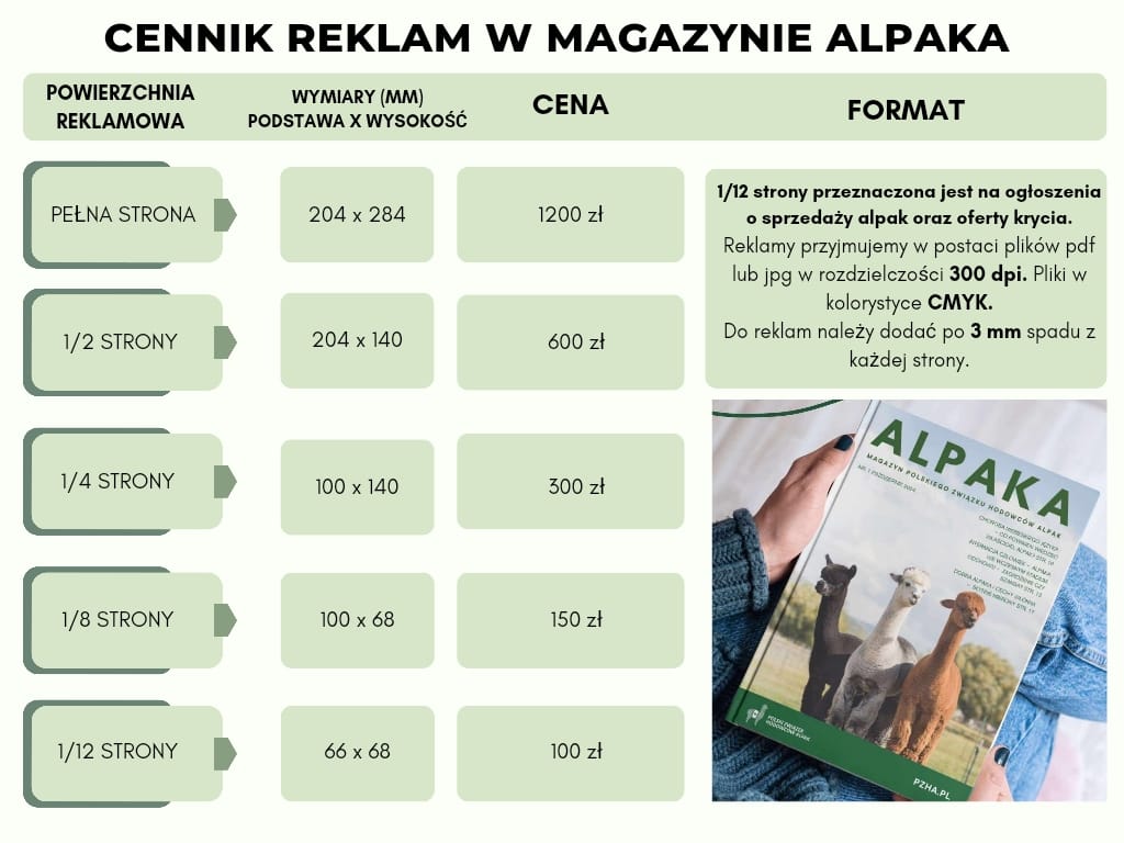 Reklama w magazynie Alpaka to inwestycja w rozpoznawalność marki w środowisku, które naprawdę zna i kocha te zwierzęta.